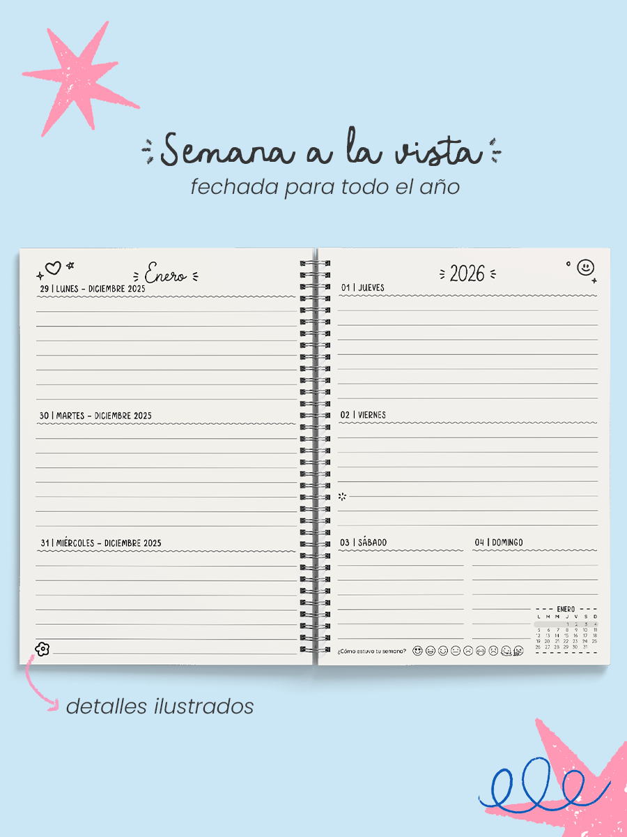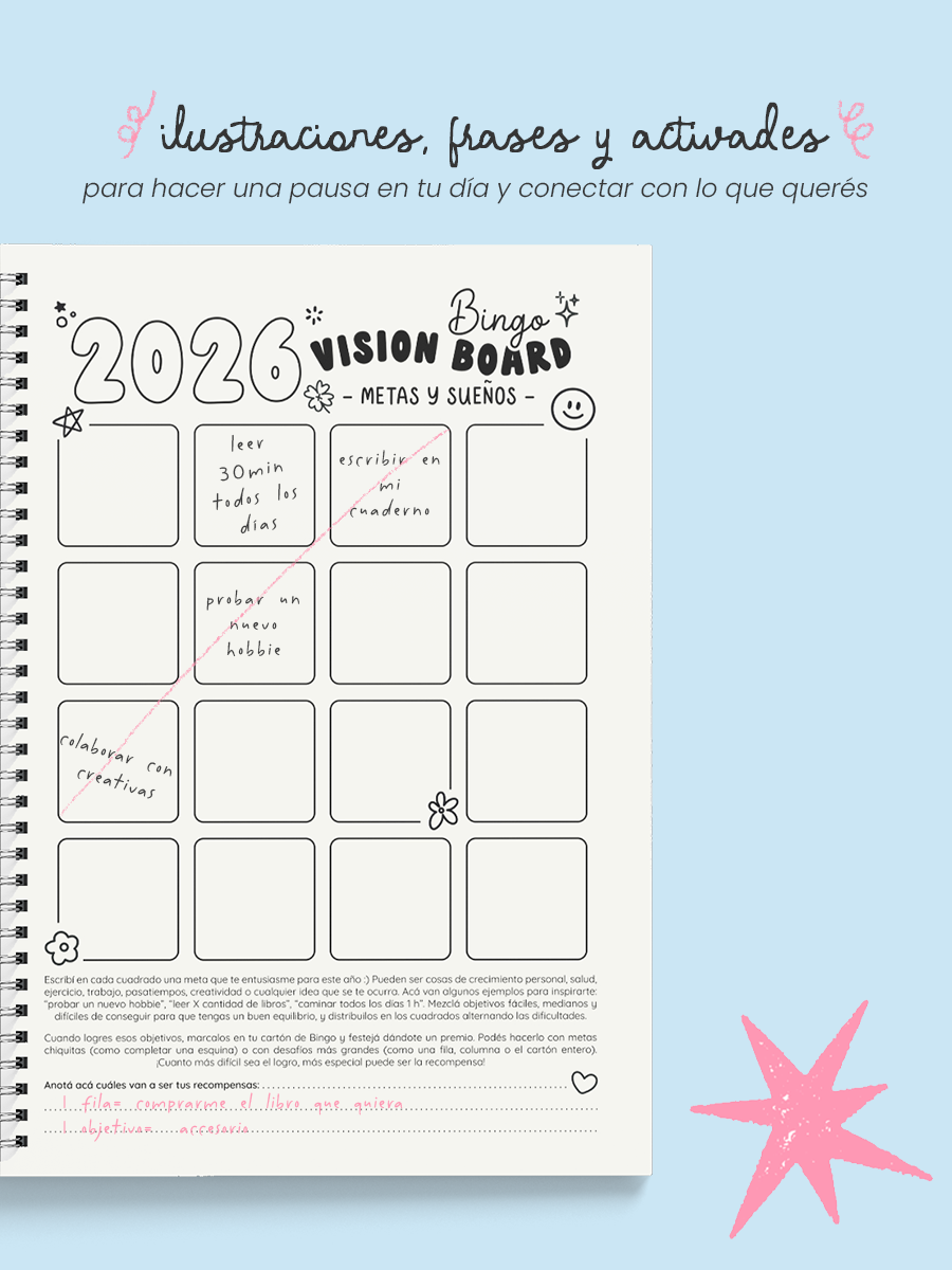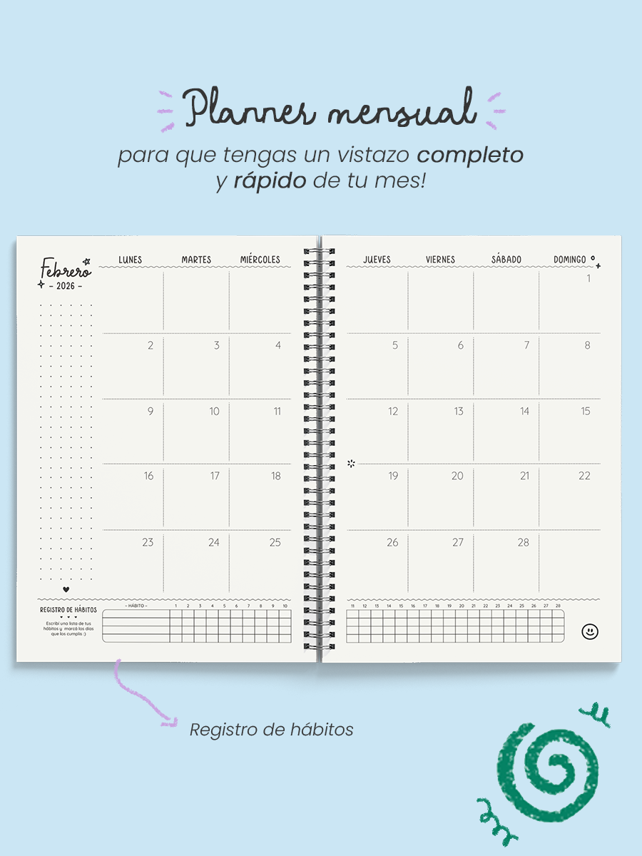 - Por cada mes: semana a la vista con renglones, planner mensual con tracker de hábitos, balance mensual (para anotar ingresos y gastos)