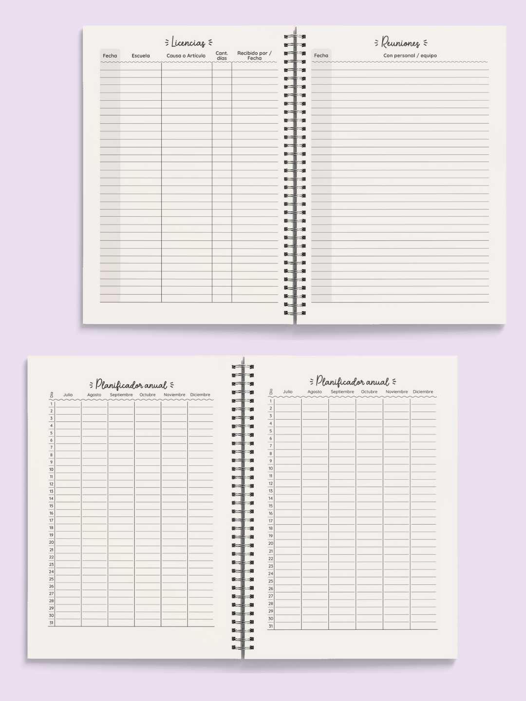- Hojas para anotar horarios, las escuelas y sus datos, designaciones, documentación presentada, licencias, reuniones, citación de padres y exámenes.