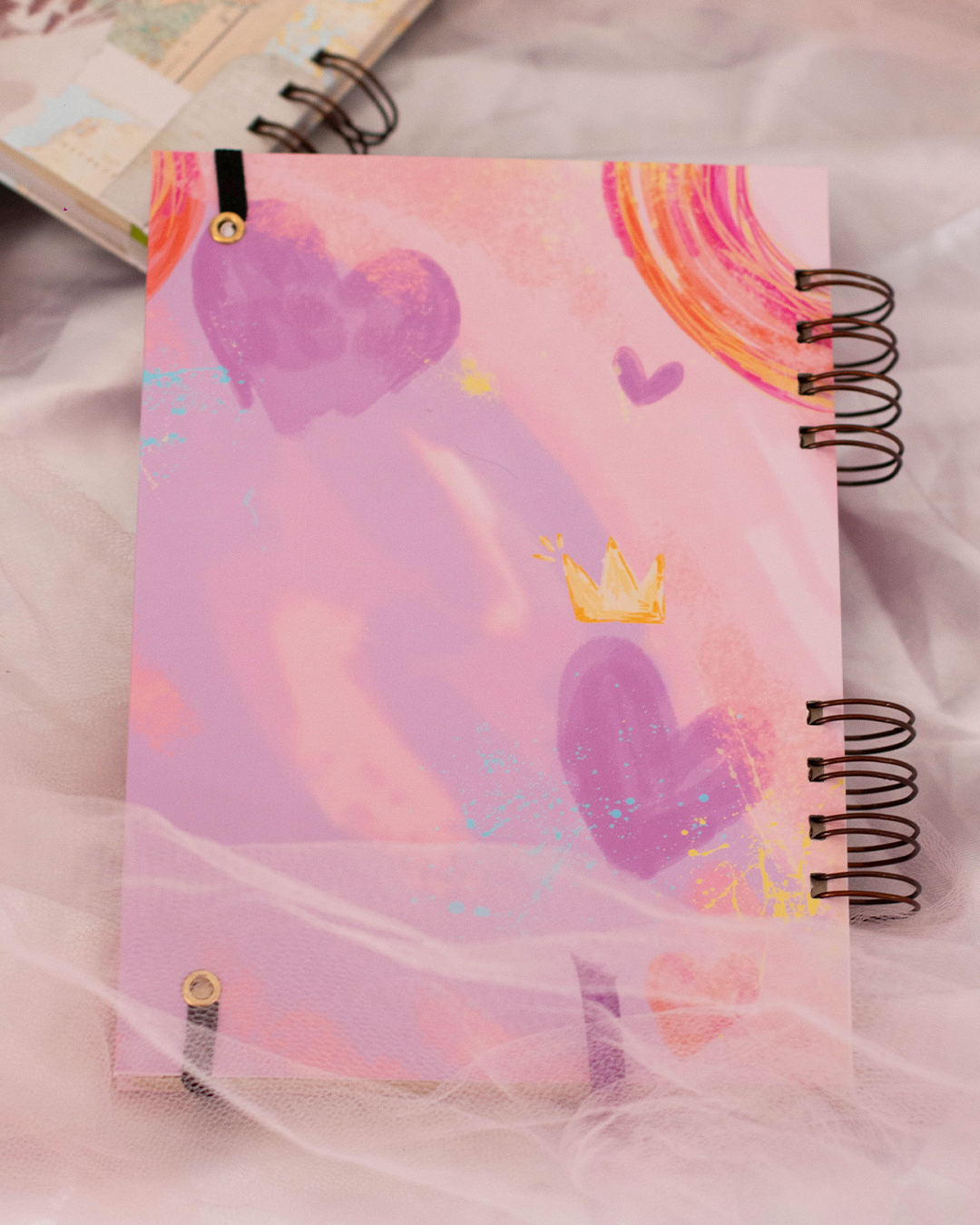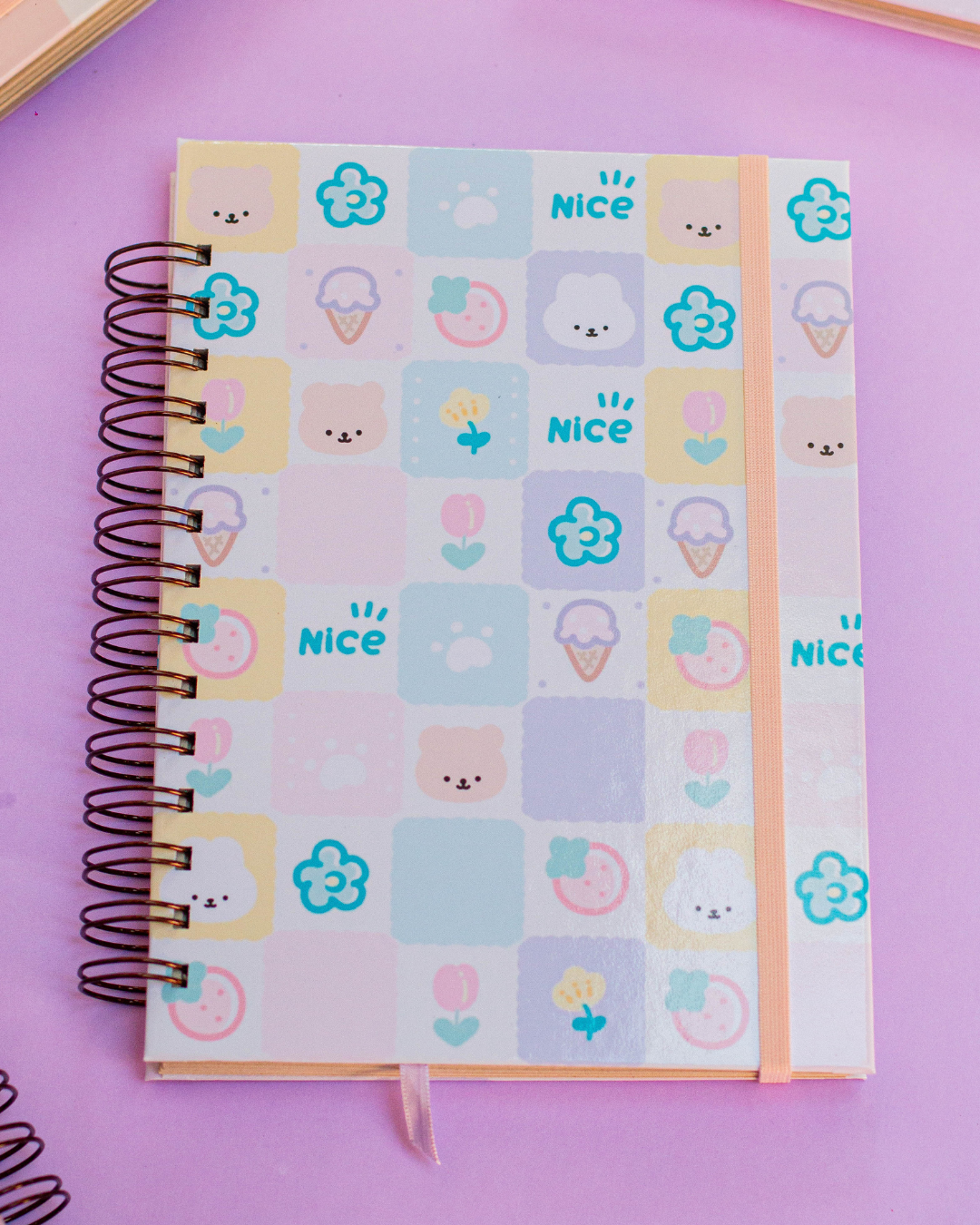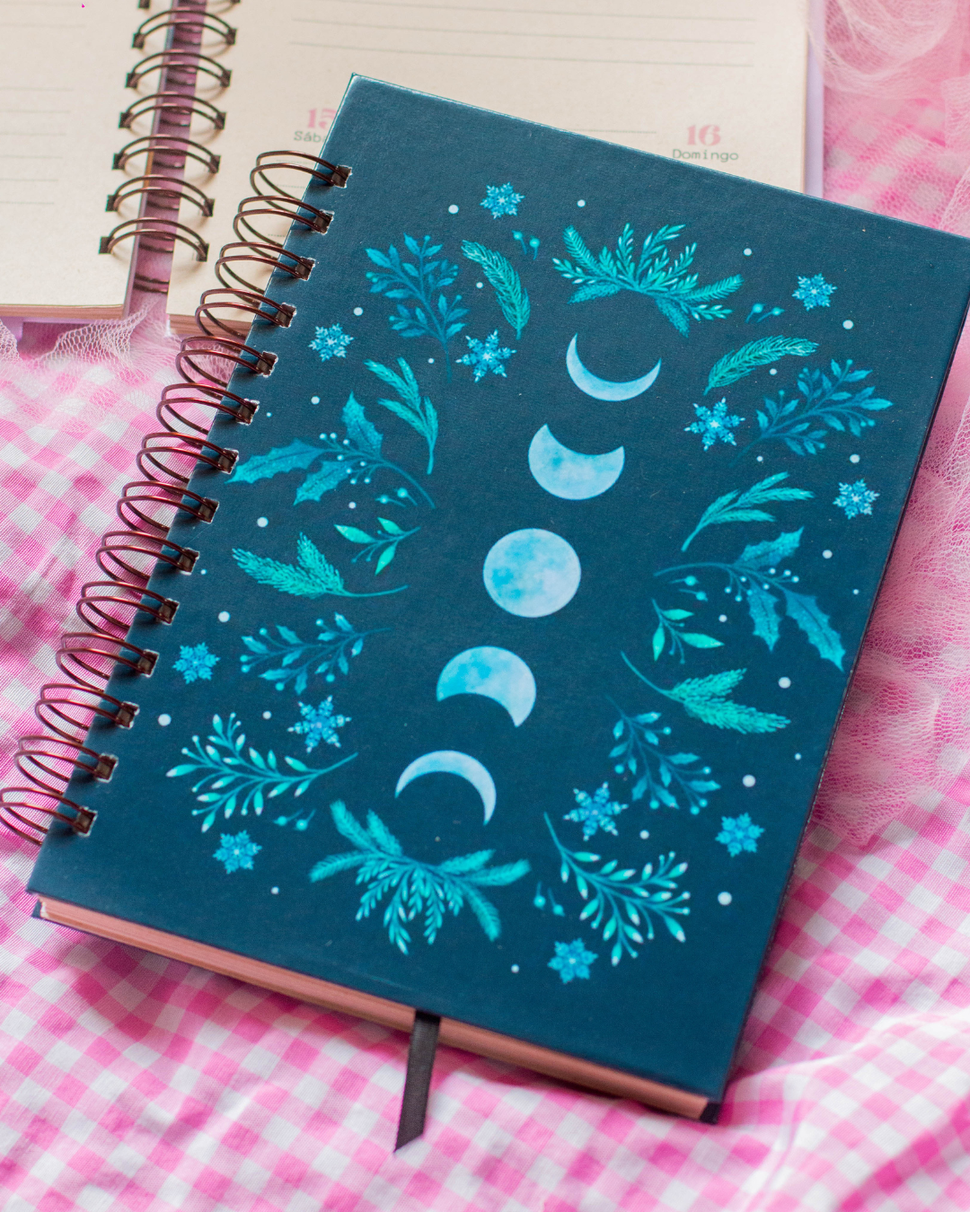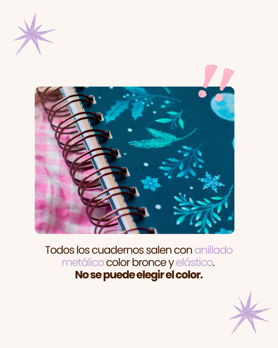 - Terminación: anillado metalico color BRONCE. con elástico y cinta marca páginas de color acorde al cuaderno